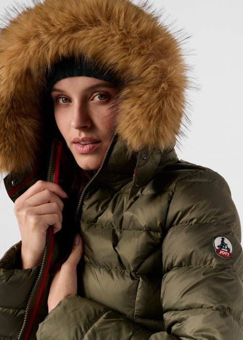 - Capuche amovible avec fausse fourrure et deux boutons-pression.