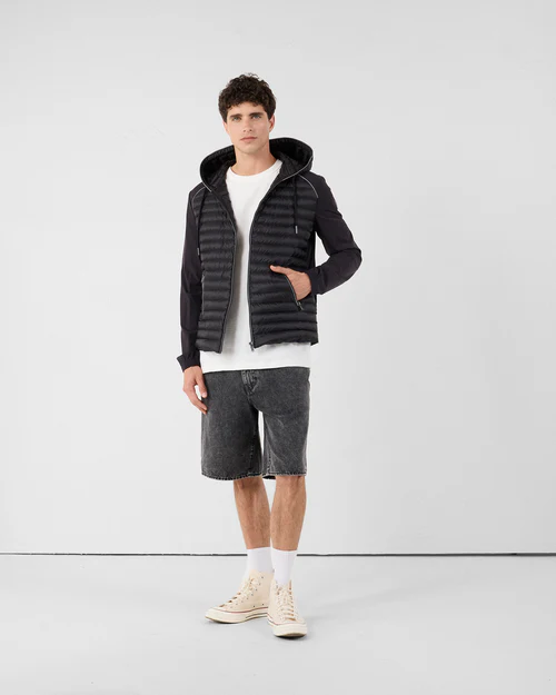 Une doudoune technique et urbaine, conçue dans un tissu mélangé alliant style et performance. Ses poches zippées et sa fermeture frontale sont soulignées par un passepoil réflecteur qui apporte une touche moderne et sécurisante. La capuche ajustable à cordons et les poignets élastiqués avec détails réflecteurs complètent cette pièce fonctionnelle et stylée, parfaite pour affronter la ville en toute confiance