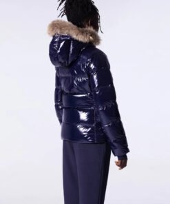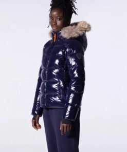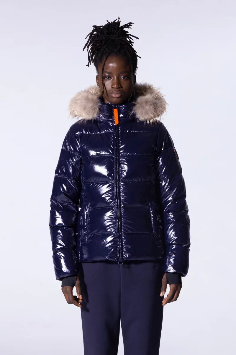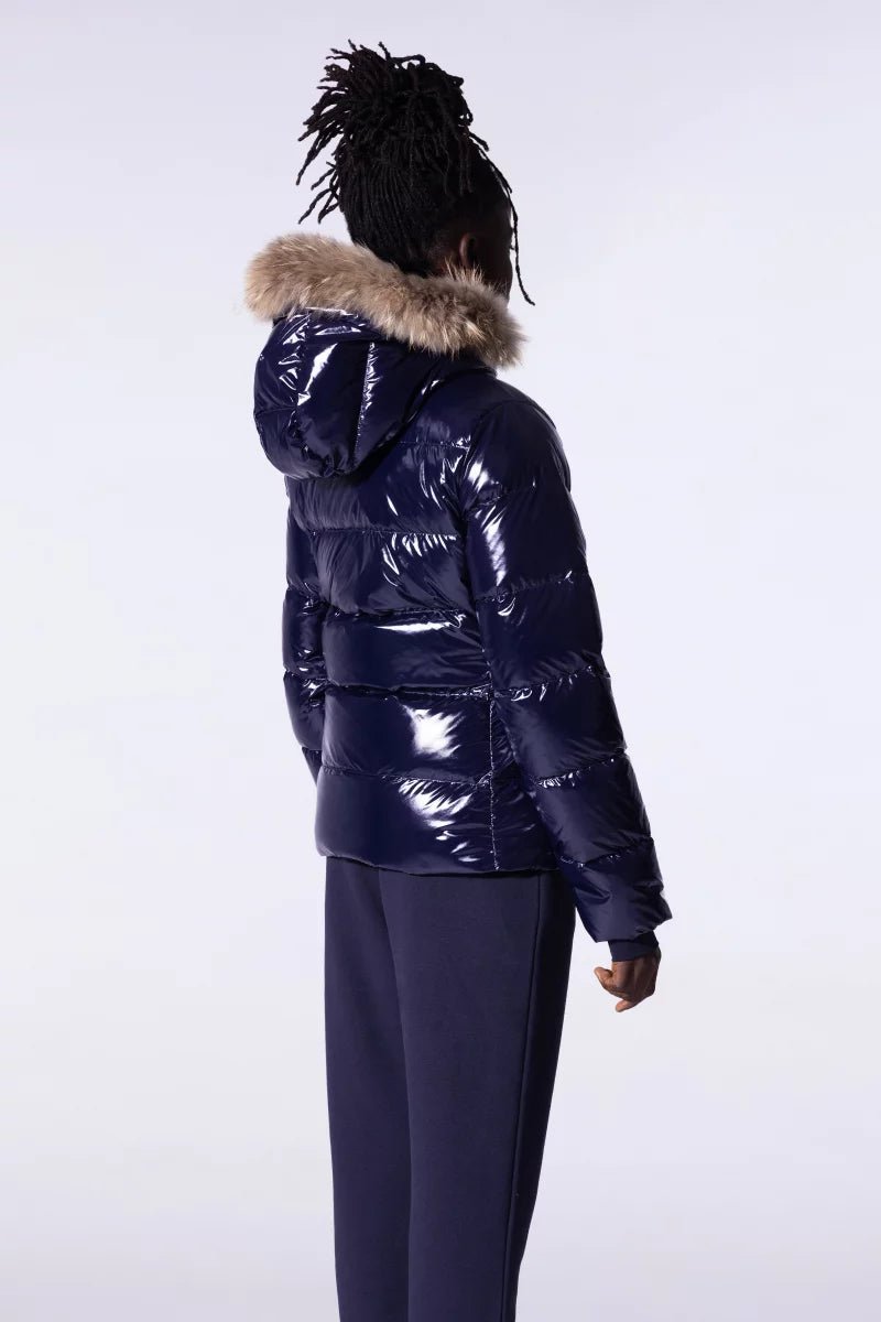 Doudoune glossy cintrée avec capuche en fourrure Olga Bright Dark Blue