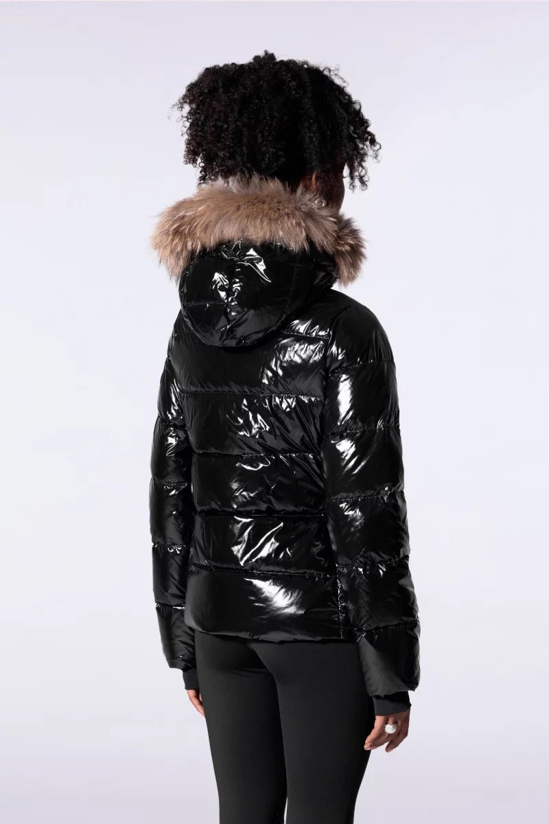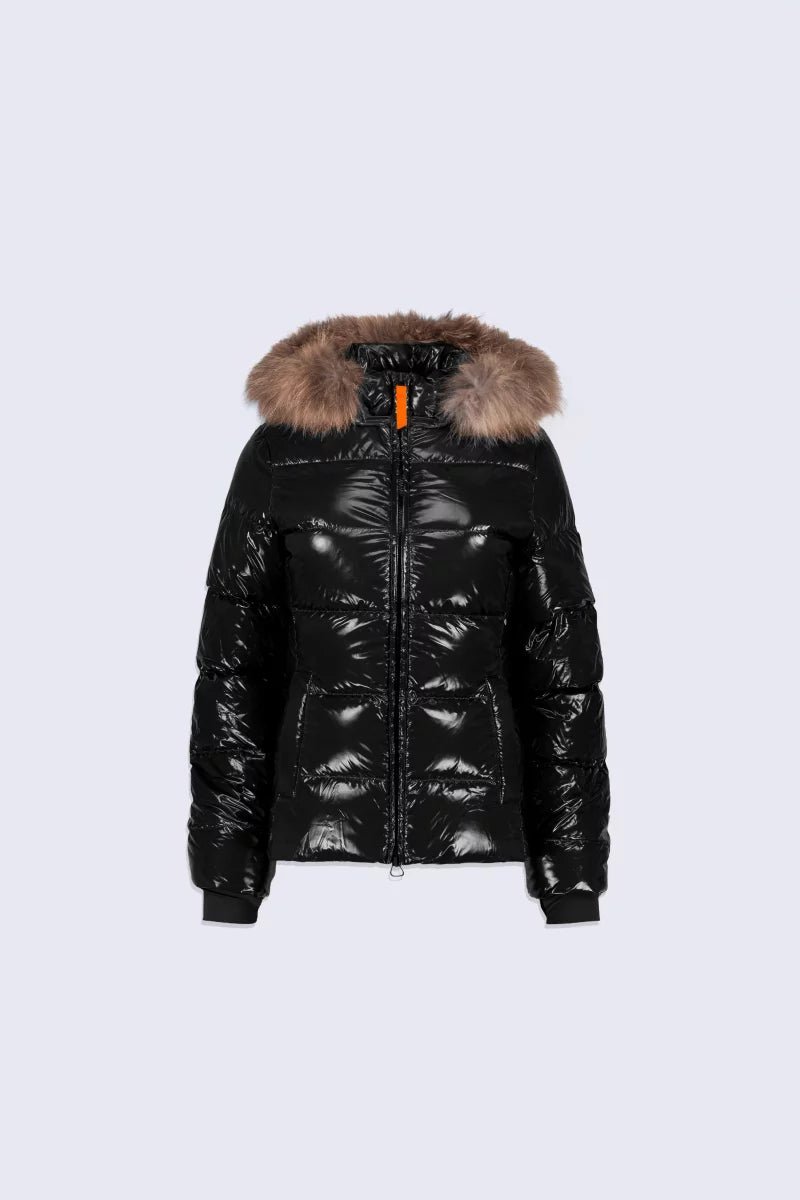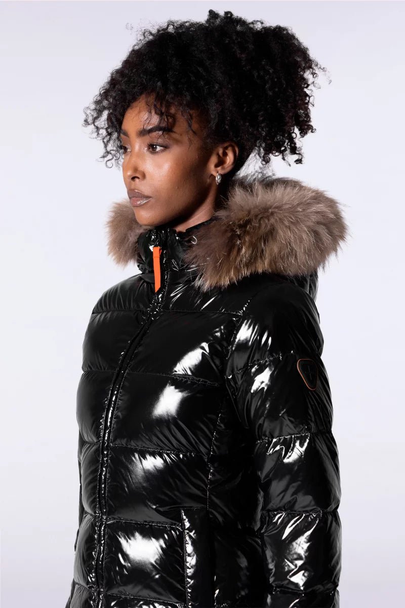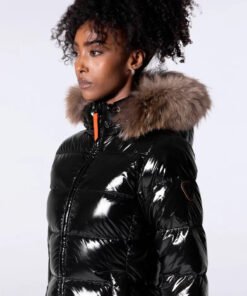 OLGA BRIGHT est une doudoune cintrée et ajustée aux épaules confectionnée en nylon. Le bas de manche est muni d’une finition ajustée avec passe-pousse. Le bas de vêtement est ajustable grâce à un cordon élastiqué. La doudoune dispose d’une capuche amovible avec fourrure véritable, amovible elle aussi. L’ouverture milieu devant se fait par un zip rehaussé d’une tirette en gros grain contrasté. Deux poches passepoilées sont insérées dans la découpe princesse. Le patch en silicone ton sur ton iconique de la marque est apposé sur l’épaule.